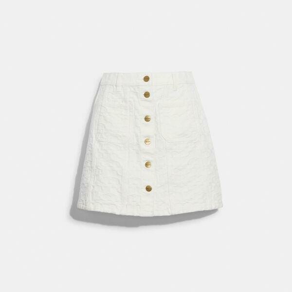 Description: Mark your look with our Signature. This A-line cotton denim mini skirt is a go-with-everything style subtly woven with our Signature. It’s finished with Coach buttons and a leather patch at the back for a touch of heritage style.