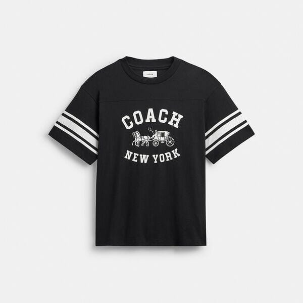 Description: Printed with a Coach graphic featuring our iconic Horse and Carriage motif, this relaxed-fit T-shirt is crafted of organic cotton made without the use of harmful chemical fertilizers and pesticides. It's finished with our sporty Varsity Stripe on the sleeves.