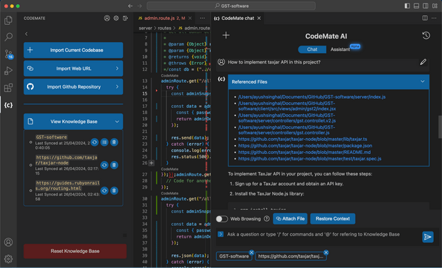 Build a knowledge base by connecting your current codebase, web URLs, and GitHub repositories to refer to later