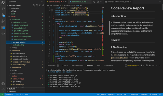 CodeMate AI analyzes your codebase using machine learning algorithms and LLMs to generate industry-standard review reports.