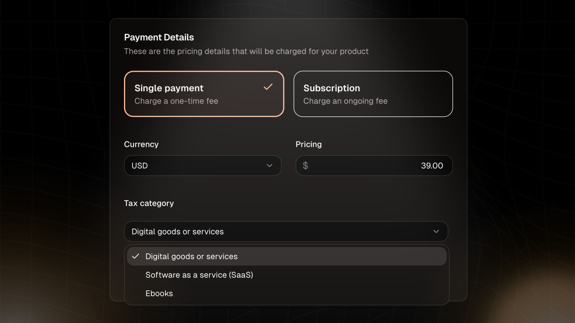Creem makes it easy to accept payments from anywhere, taking all your tax headaches away—simply create a product, set the price, and choose a tax category.