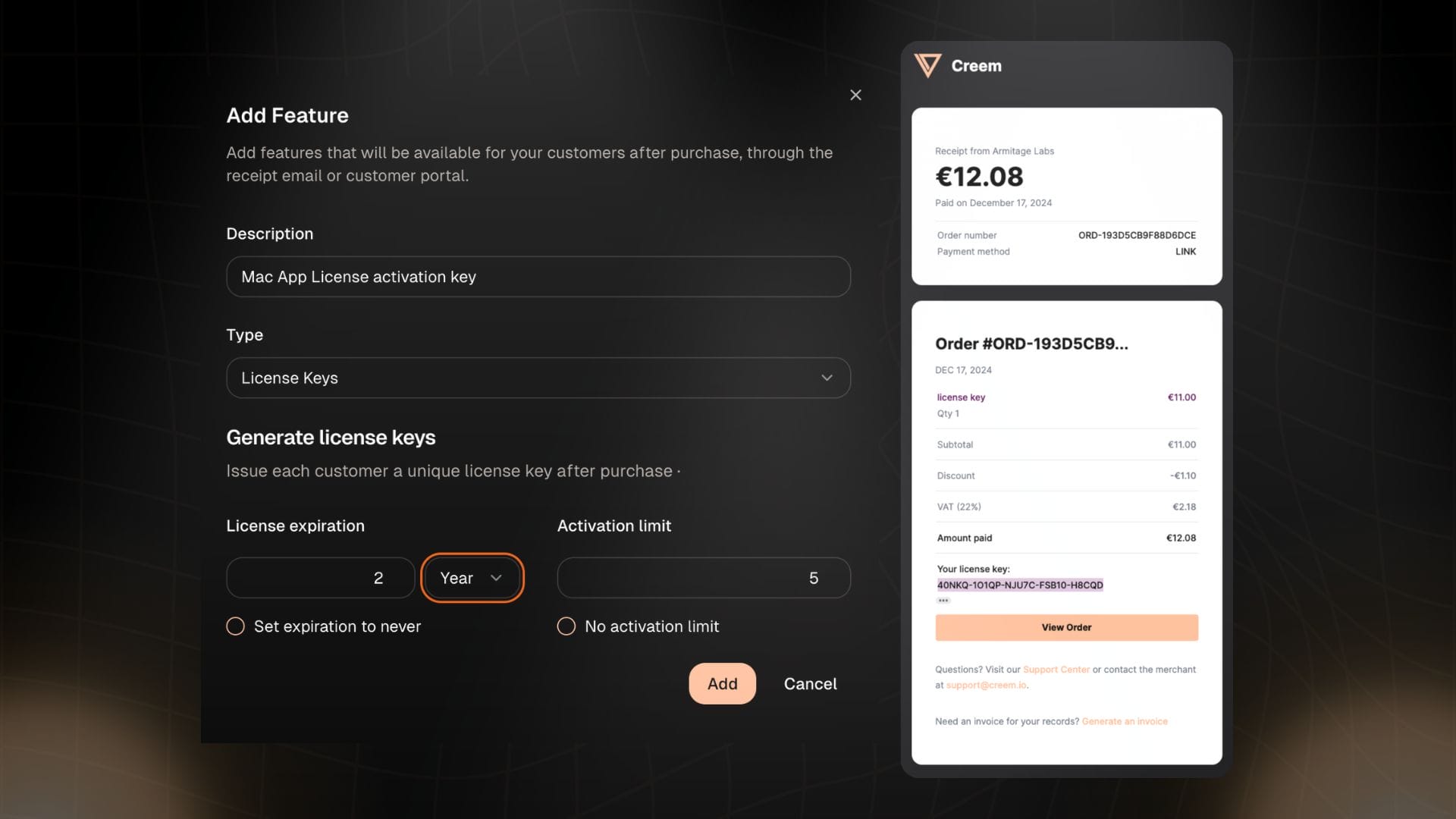 Activate and validate license keys effortlessly using Creem’s built-in license key engine