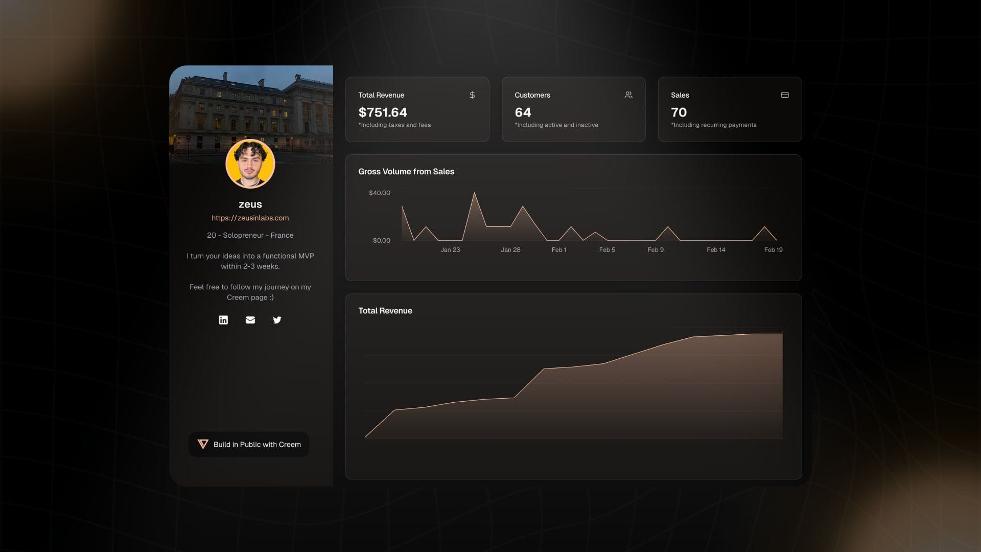 Creem is also packed with Build in Public pages, so you can showcase your verified earnings on a slick dashboard.