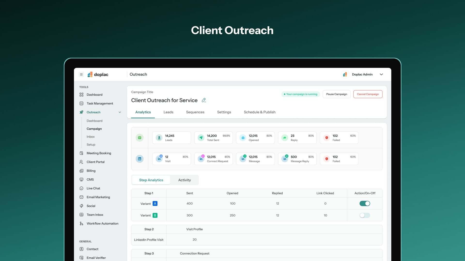 Doplac helps you automate outreach, manage your pipeline, close more clients, and create a new revenue stream with white labeling capabilities.
