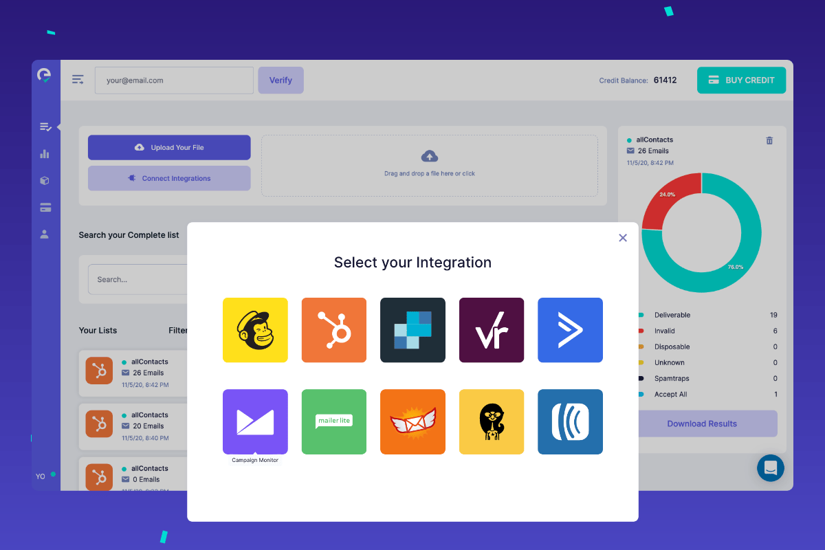 Integrate with major marketing services, like Mailchimp and HubSpot, to easily verify your lists!