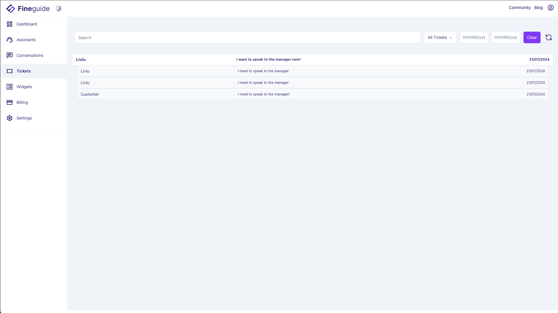 Even the best AI assistant can’t handle every issue, which is why Fineguide lets users request your support team with the built-in ticketing system.