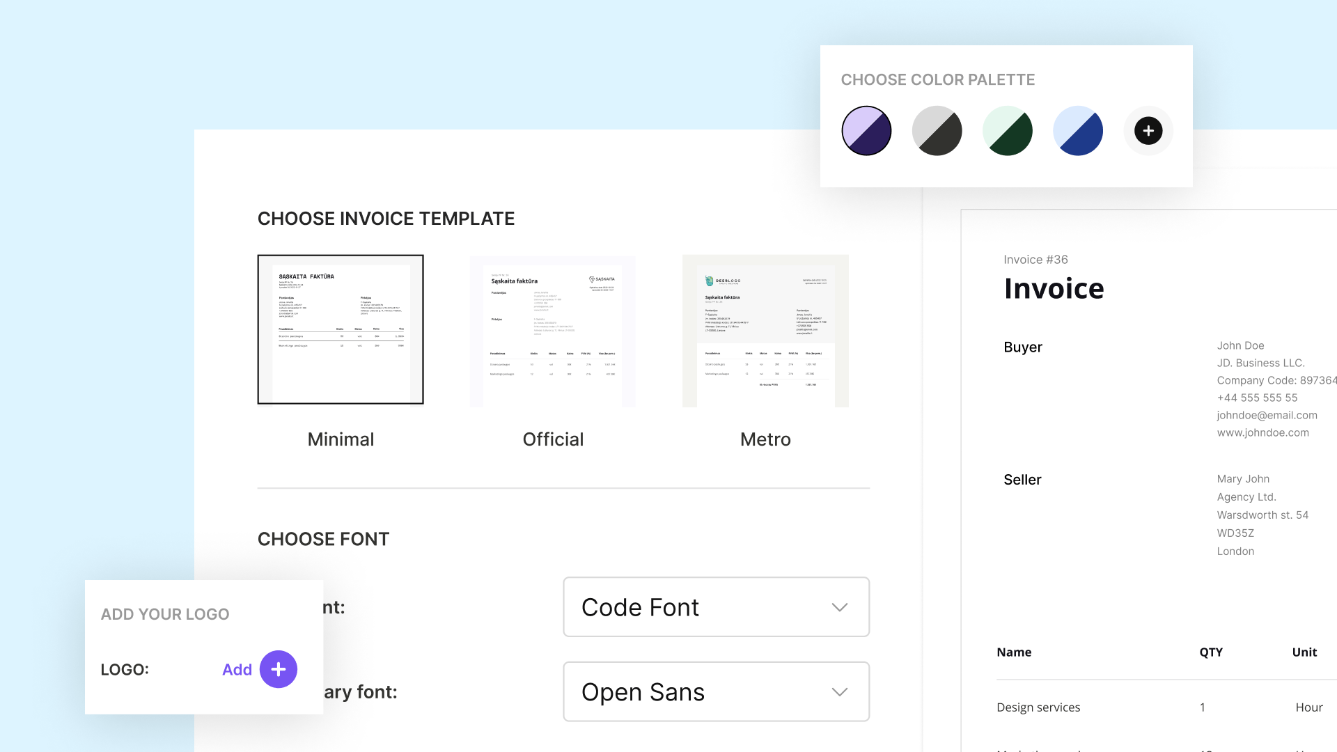 Design professional invoices using professional templates and this easy-to-use invoice builder