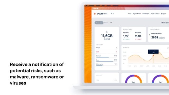 Best of all, the Cyber Alarm analyzes your activity and sends real-time notifications about potential risks, like malware, ransomware, and viruses.