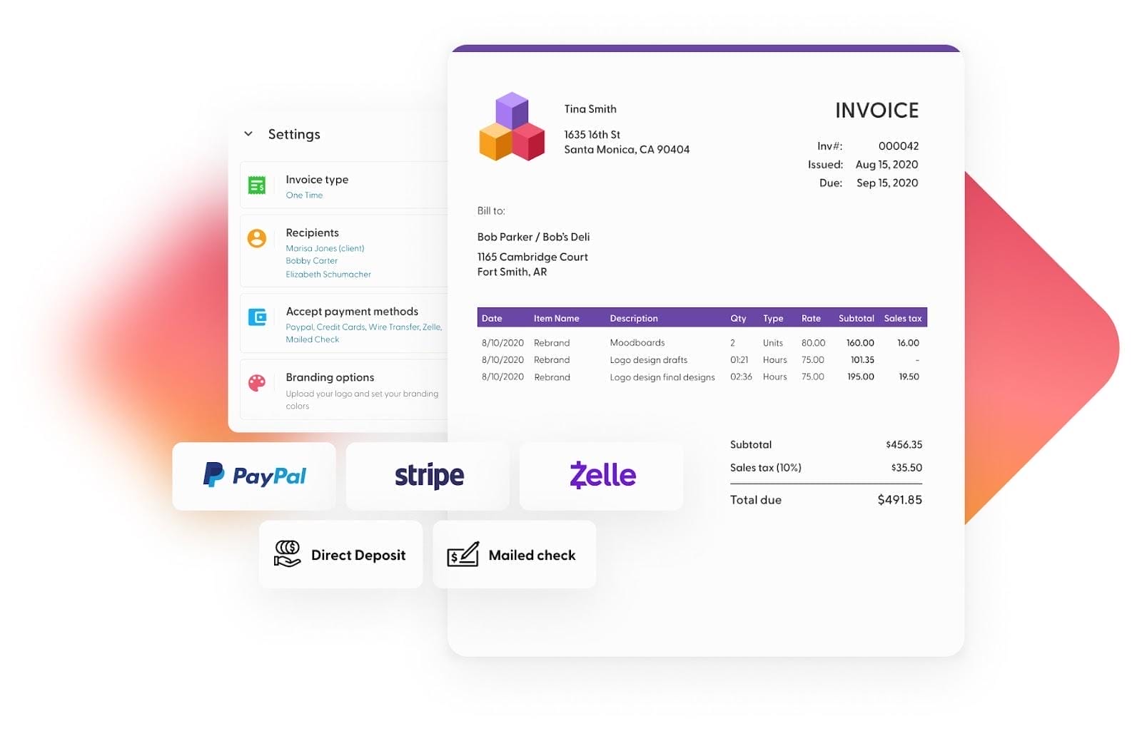 Customize and send branded invoices in minutes to get paid on time.
