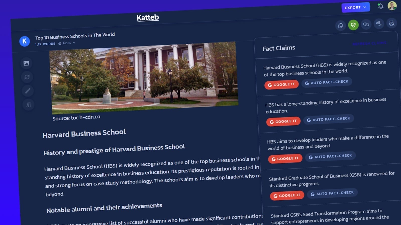 Lucky for you, Katteb is packed with features to help you generate content that’s fact-checked via credible sources, so your content is always reliable.