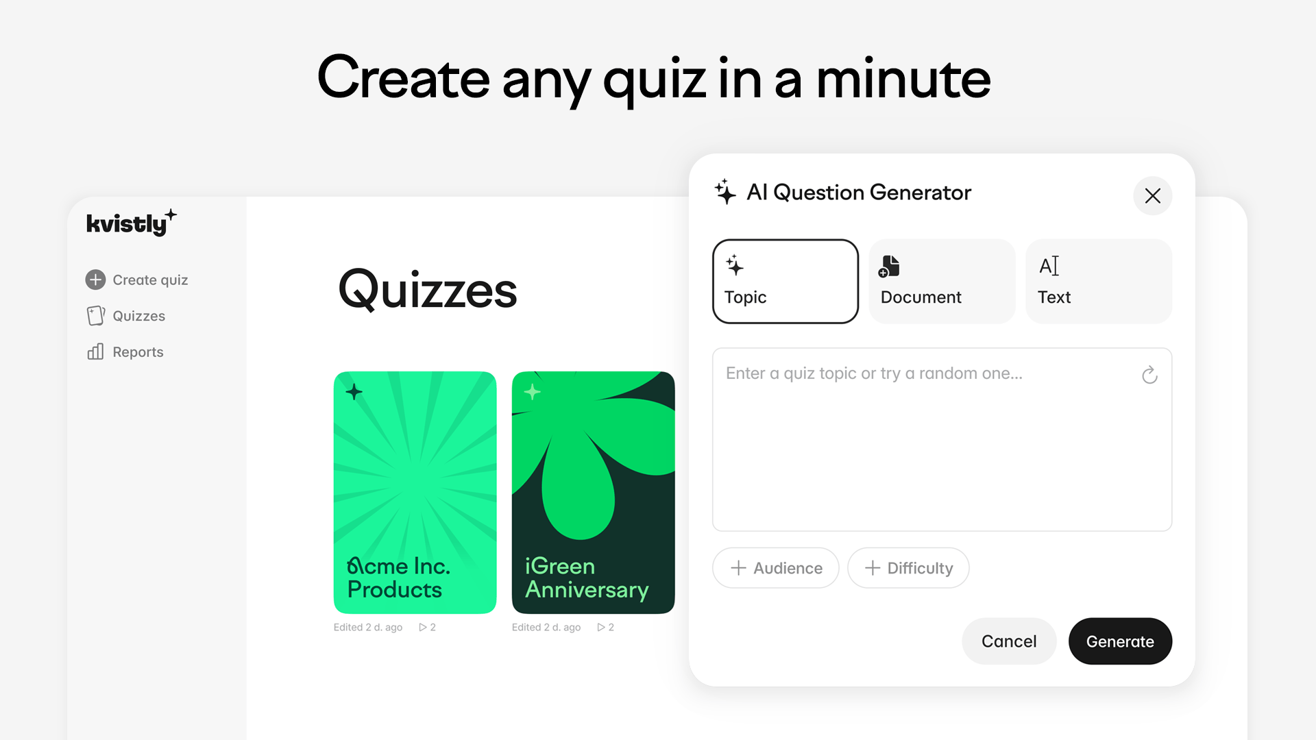 Within minutes, Kvistly helps you generate personalized quizzes on any topic—perfect for training, team building, and events.