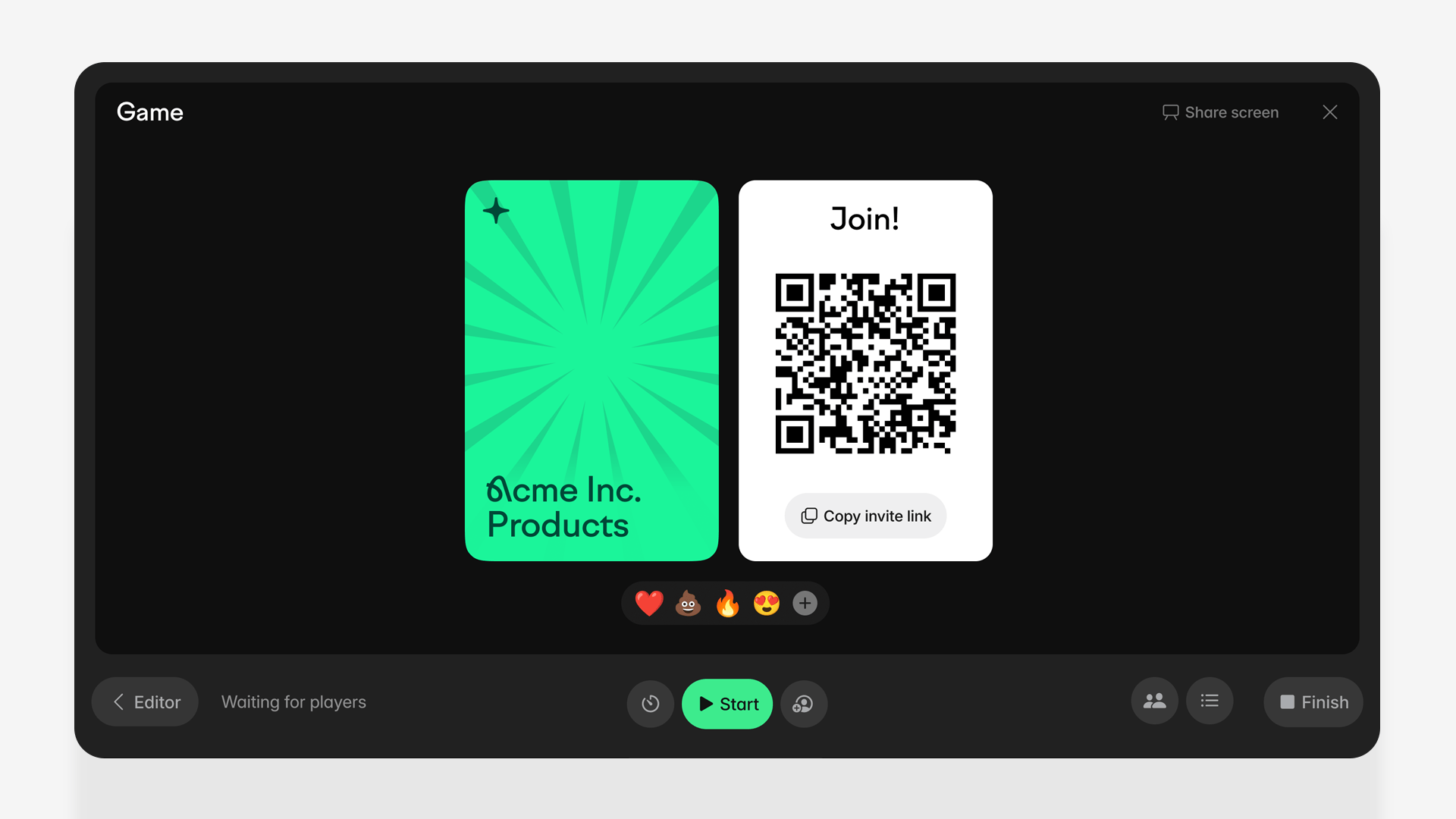 Share quizzes over video calls, at offline events, with a QR code, or via link.
