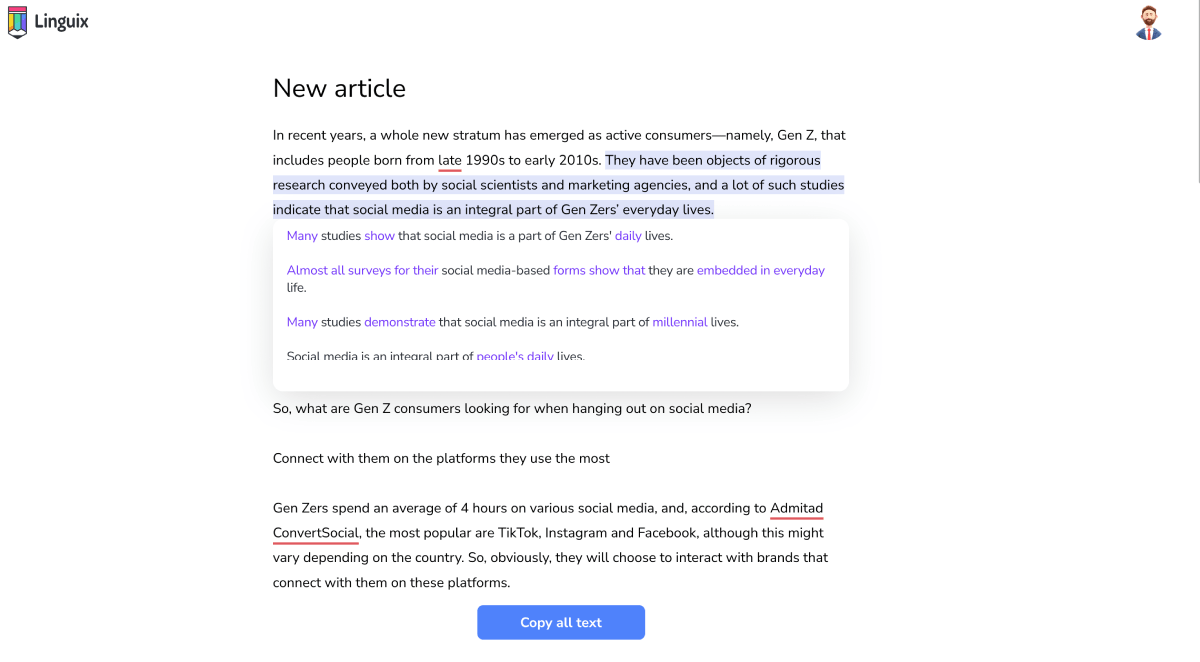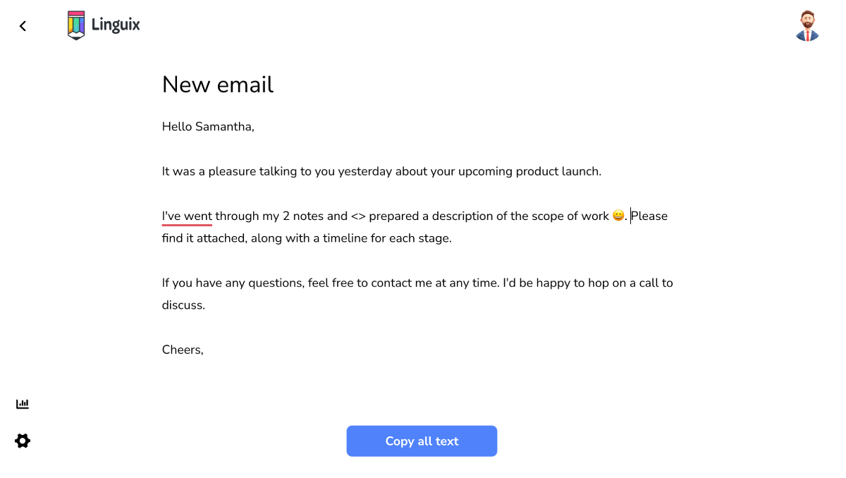 Linguix is an AI-powered writing assistant that checks your writing for errors and gives you grammar, style, and vocab recommendations.