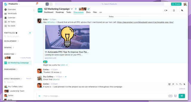 Connect and collaborate with your team using real-time messages you can easily turn into tasks