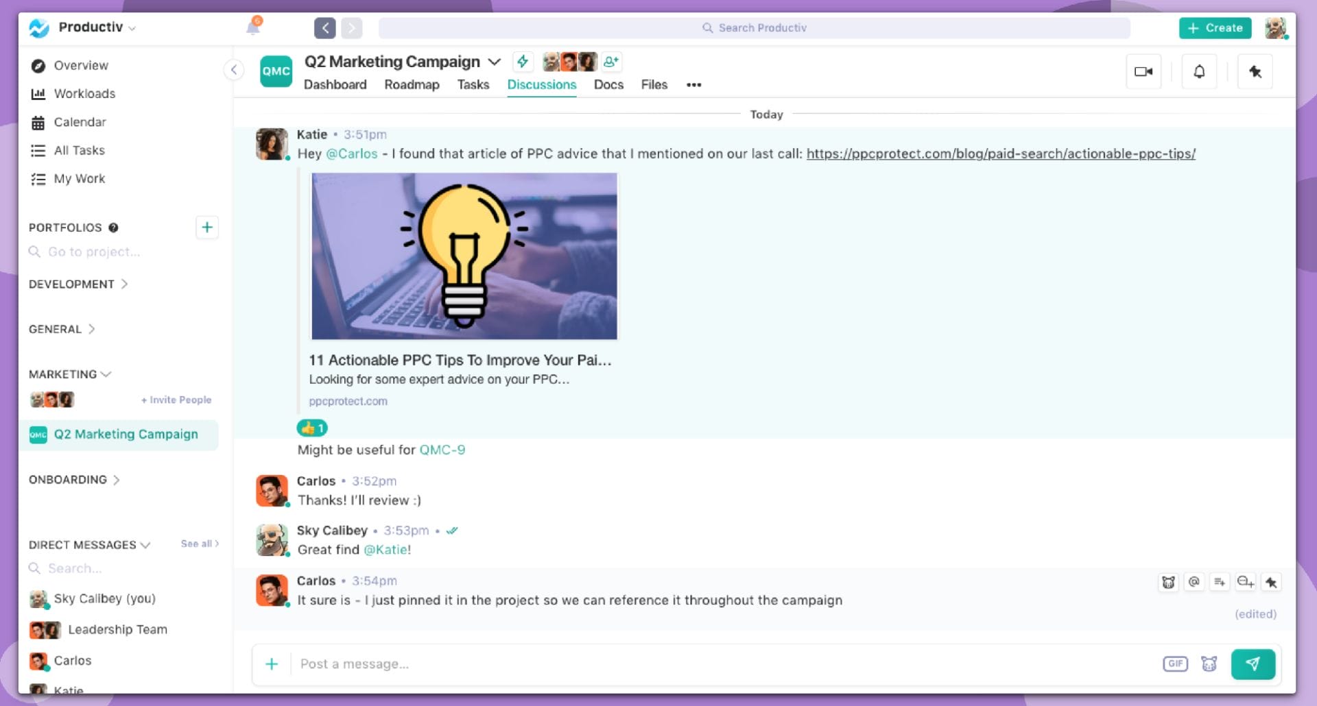 Connect and collaborate with your team using real-time messages you can easily turn into tasks
