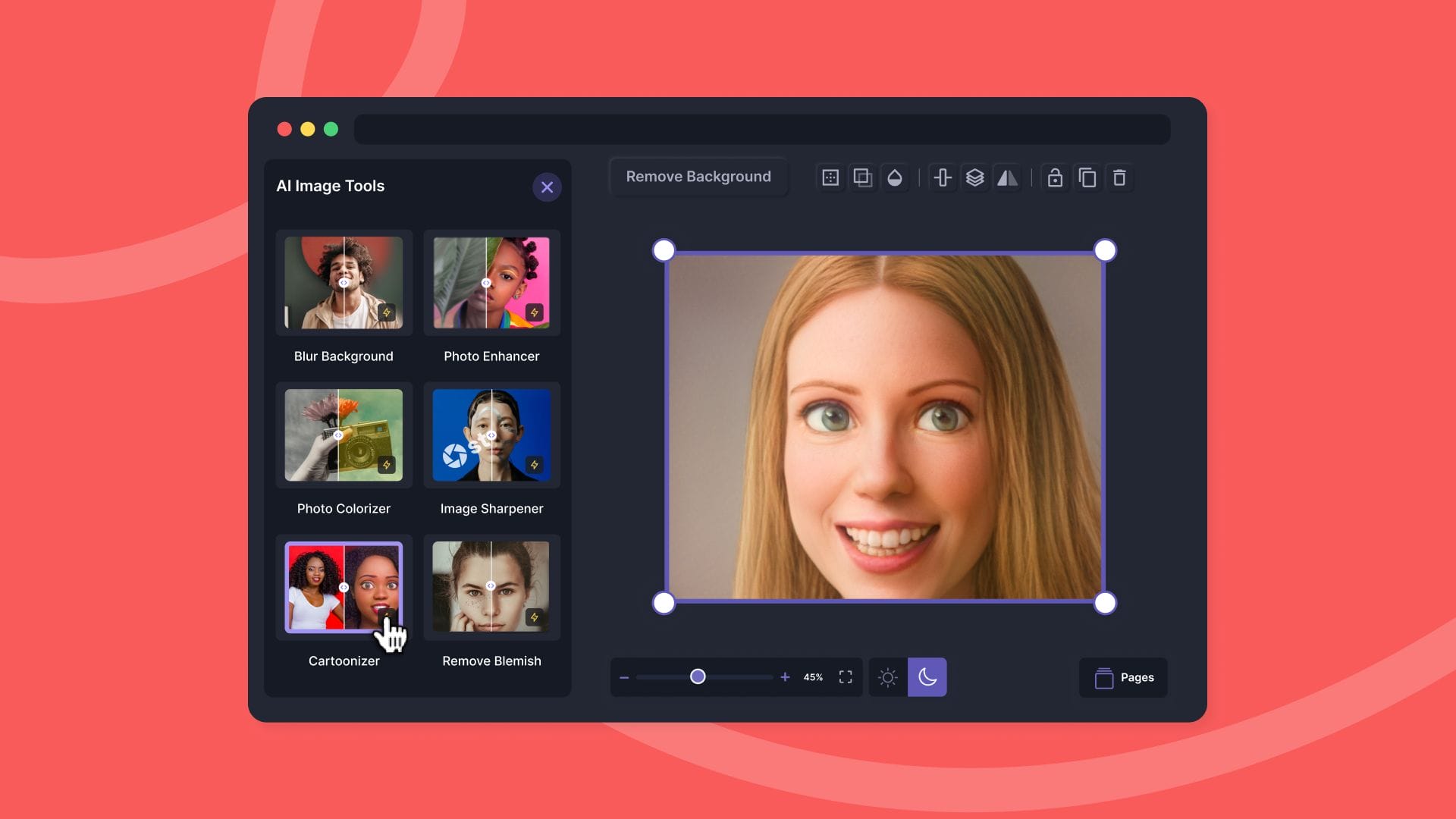 Bring your creative ideas to life with features like AI image generation, AI photo editor, background remover, and more