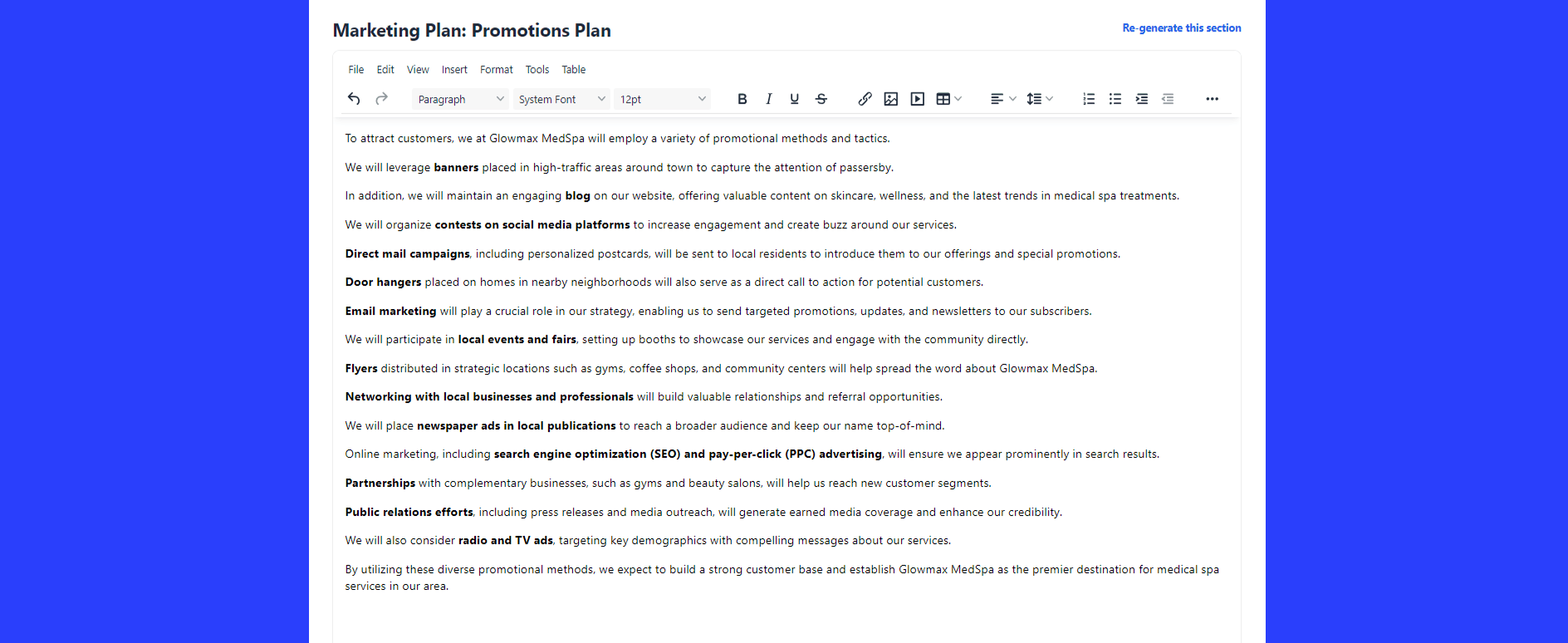 Generate a business plan complete with marketing strategies and financial projections in minutes using AI