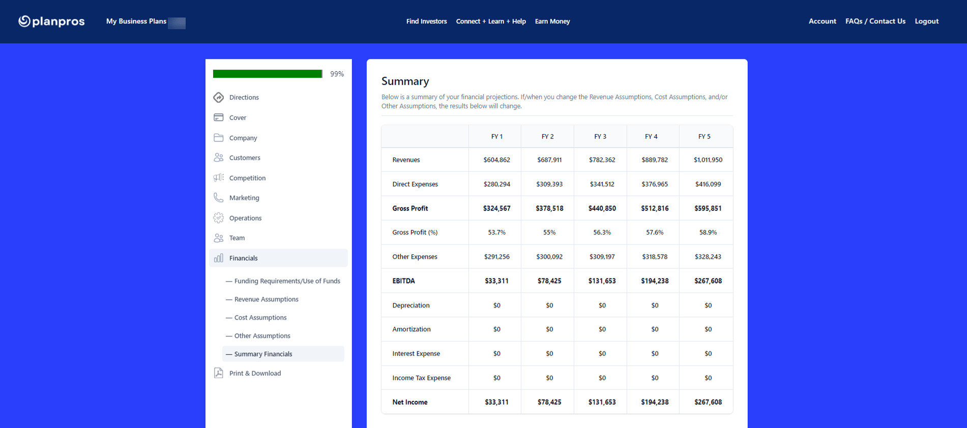 PlanPros.ai generates business plans, complete with marketing strategies and 5-year financial projections, so you can impress any investor.