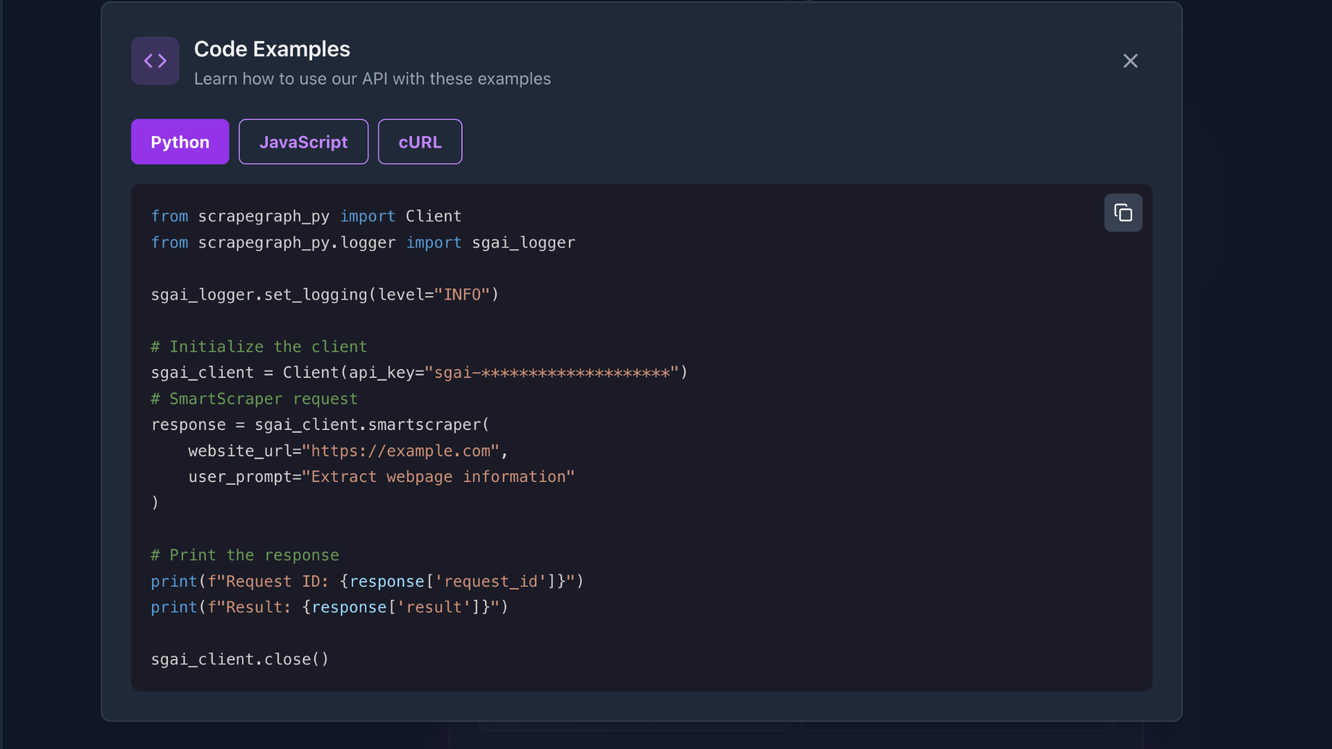 Copy code with one click to integrate search queries and results in your data pipeline