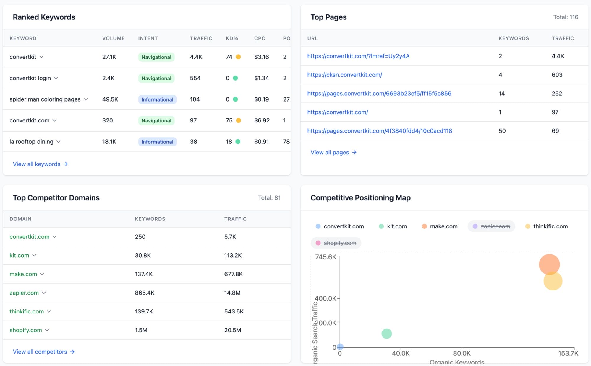 Break down any site’s SEO performance, revealing traffic-driving pages, best-performing keywords, backlink sources, and more