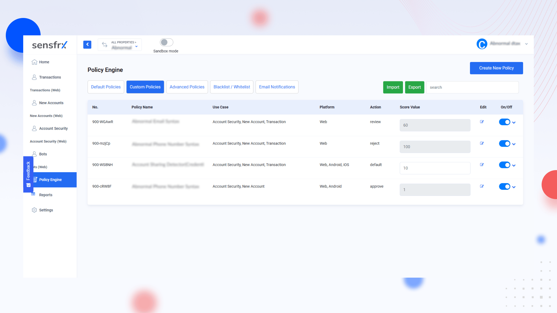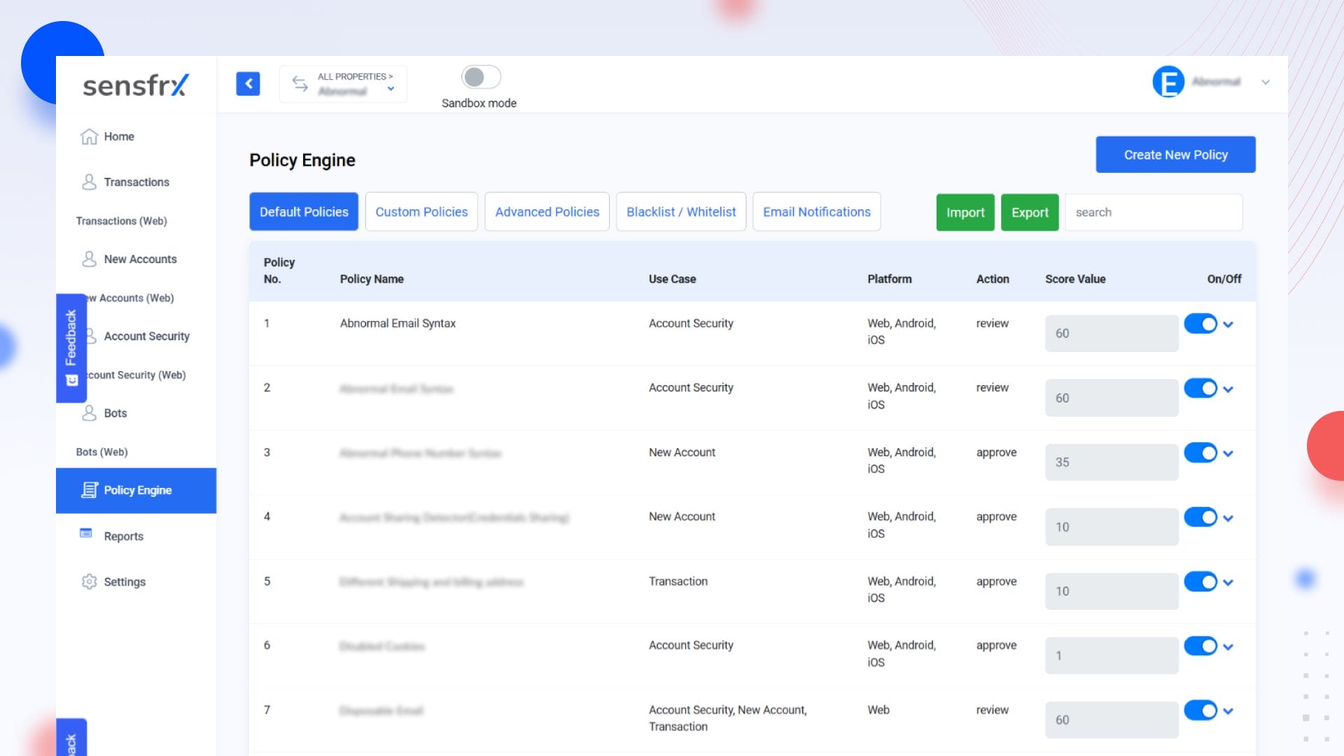 This platform comes with policies designed to flag common fraudulent behavior targeting account security, new accounts, and transactions—often performed by automated bots.