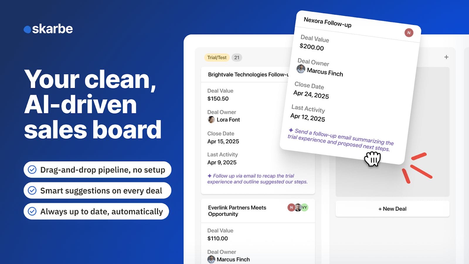 Ditch your clunky CRM! With Skarbe, you can easily track and visualize your sales pipeline on a drag-and-drop kanban board.