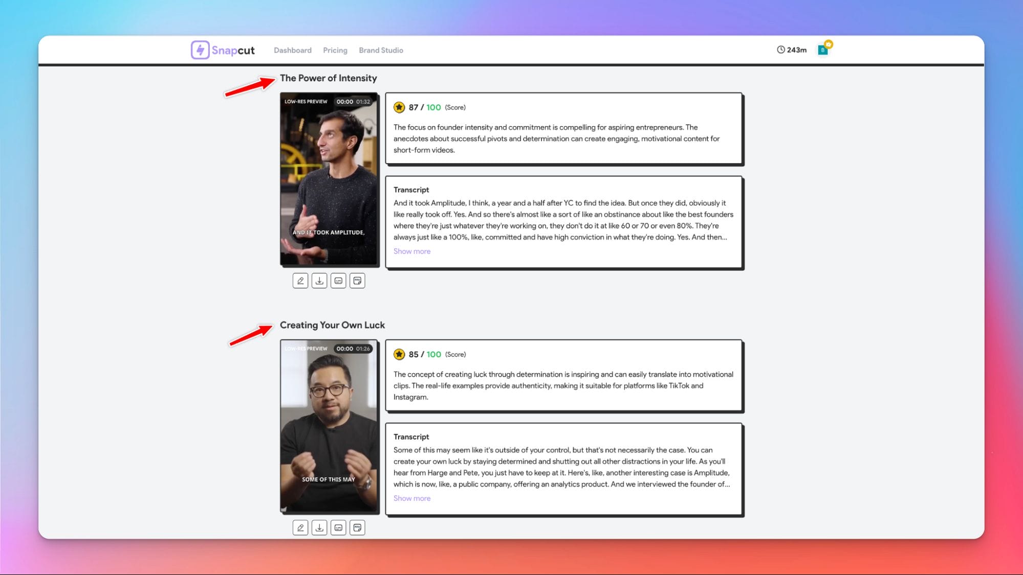 Using Snapcut’s advanced AI algorithms, you can easily select your hooks after identifying the most viral-worthy moments in your long-form video content.