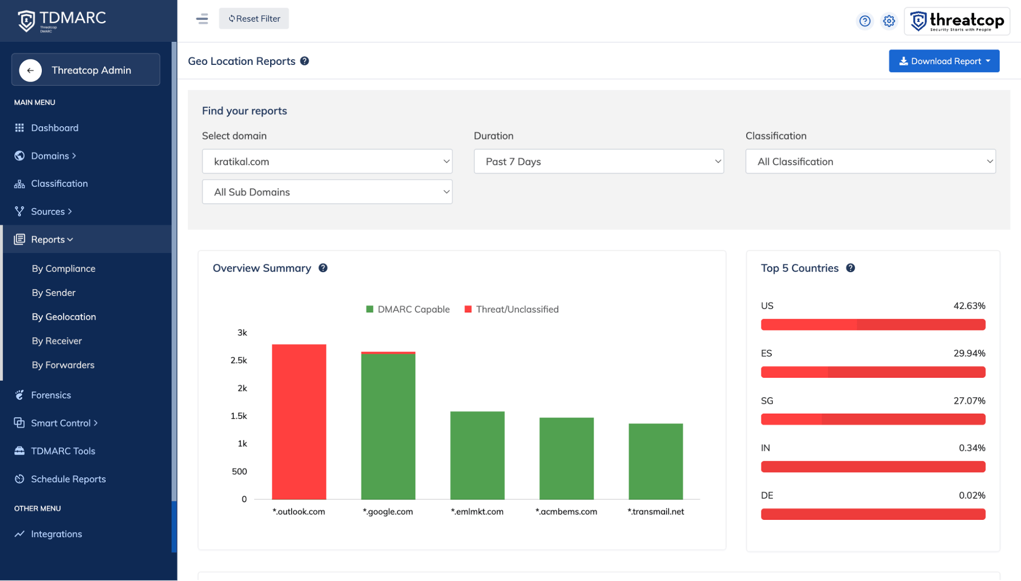 Access five different reports based on compliance, sender, geolocation, receivers, and forwarders