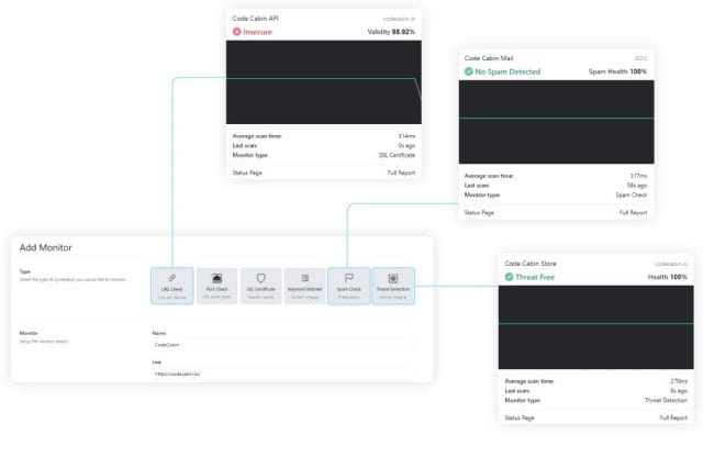 Get unlimited monitoring for your websites, servers, SSL certificates, spam scores, threats, and more