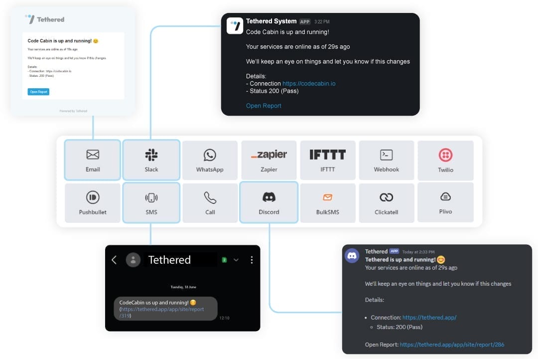 Even better, Tethered integrates with your favorite platforms like email, Slack, Discord, SMS, and WhatsApp, to send notifications about any downtime issues.