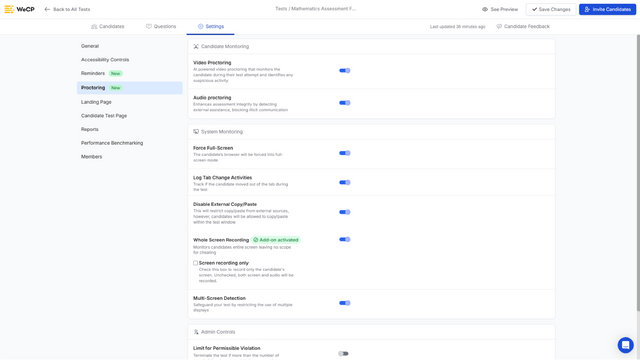 Access granular security features like blocking copy-paste or setting violation limits before ending the test
