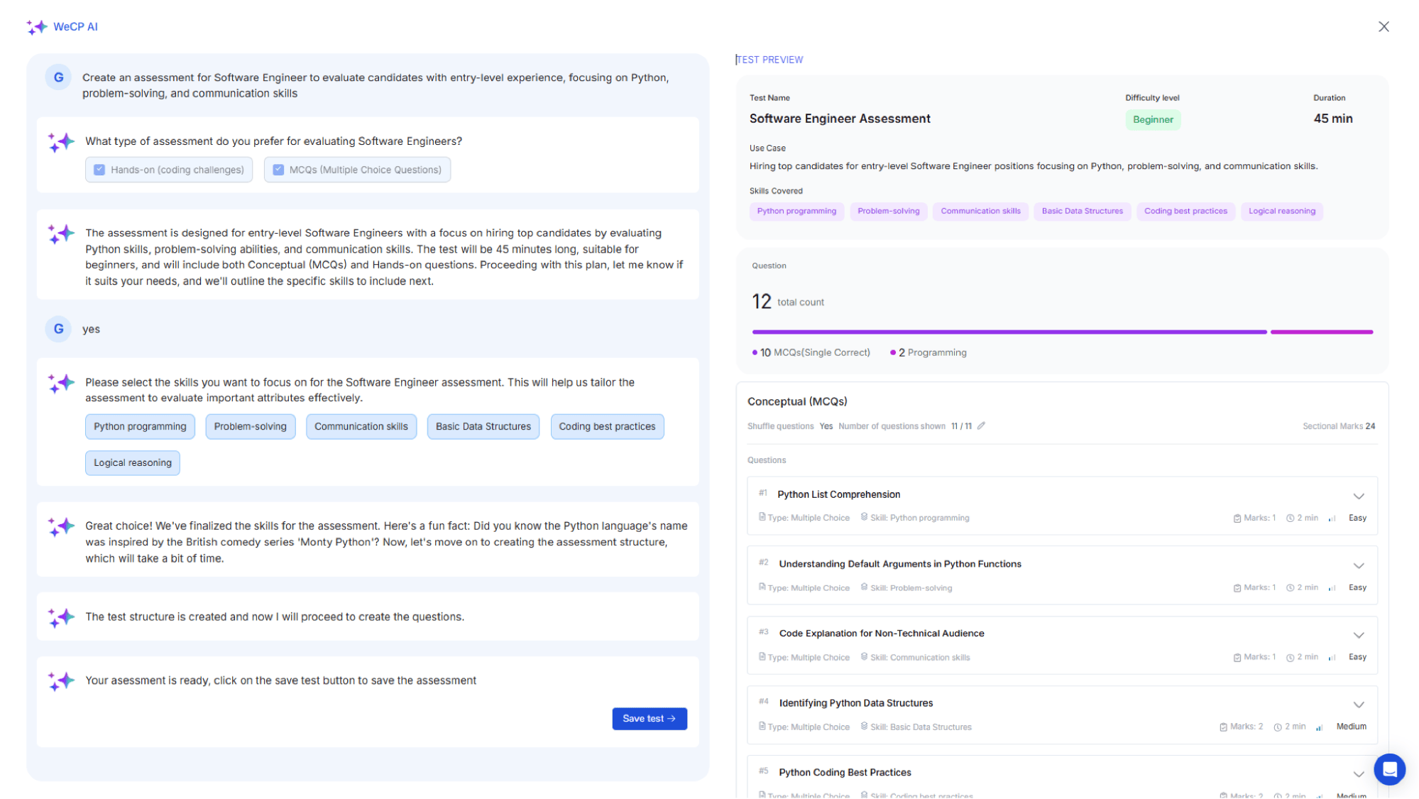 Using the power of AI, WeCP lets you generate assessments for various use cases in minutes—not days.