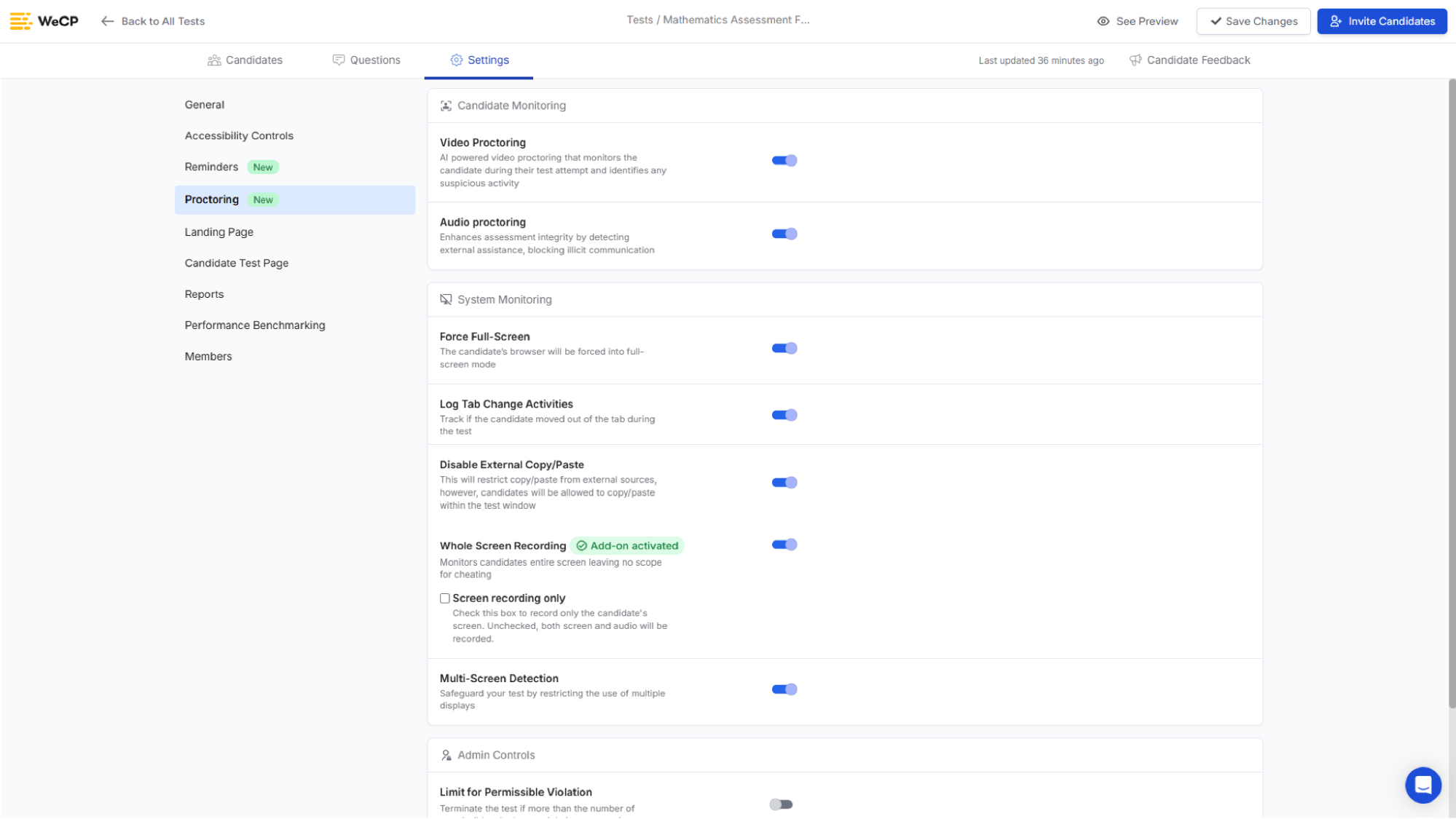 Access granular security features like blocking copy-paste or setting violation limits before ending the test