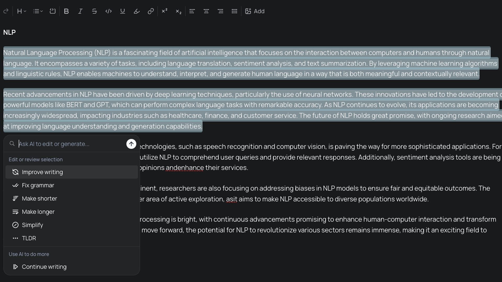 Enhance note-taking with AI features, like fixing grammar, simplifying text, generating TL;DRs, and more