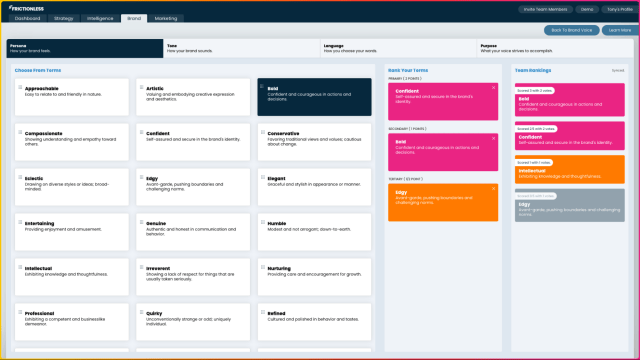 Frictionless makes it easy to answer curated questions that help you define your brand’s vision, mission, and positioning.