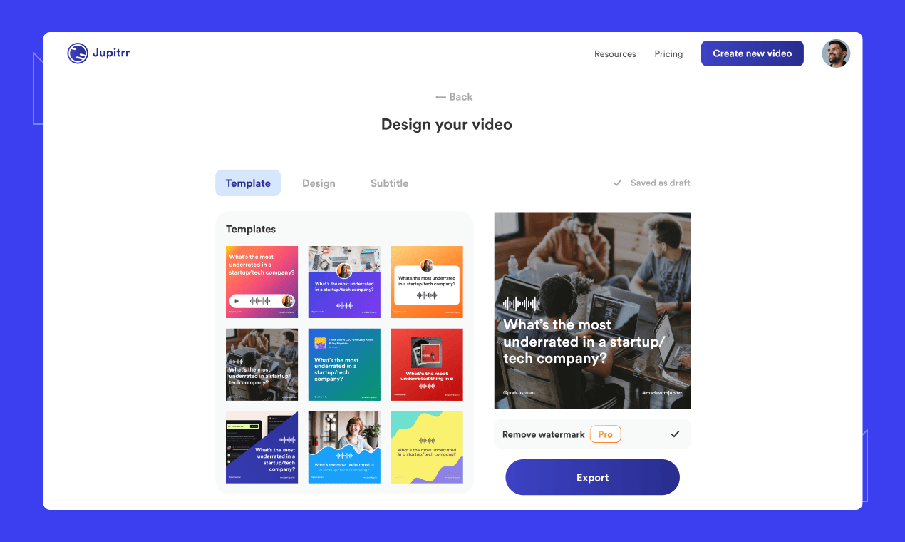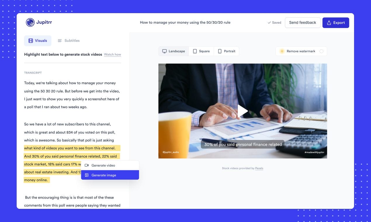 Jupitrr is an AI-powered video maker that lets you generate stock footage and captions with a single click.