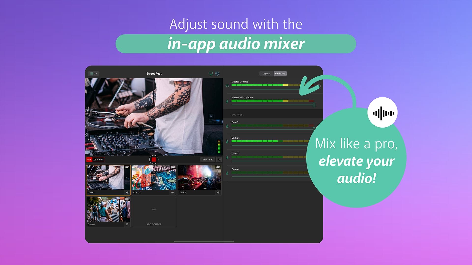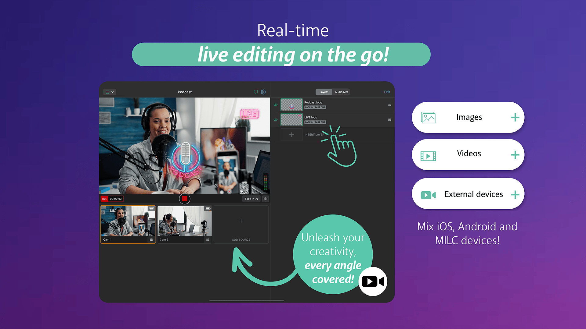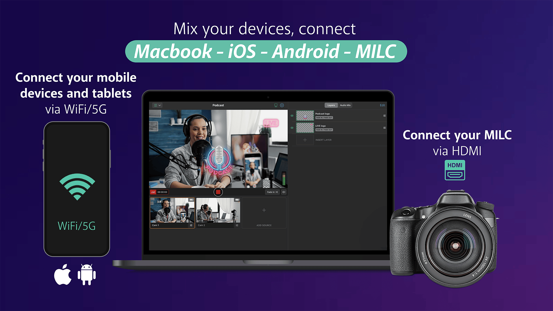 Connect with up to 12 iOS, Android, MacOS, or MILC devices to shoot engaging videos from multiple angles