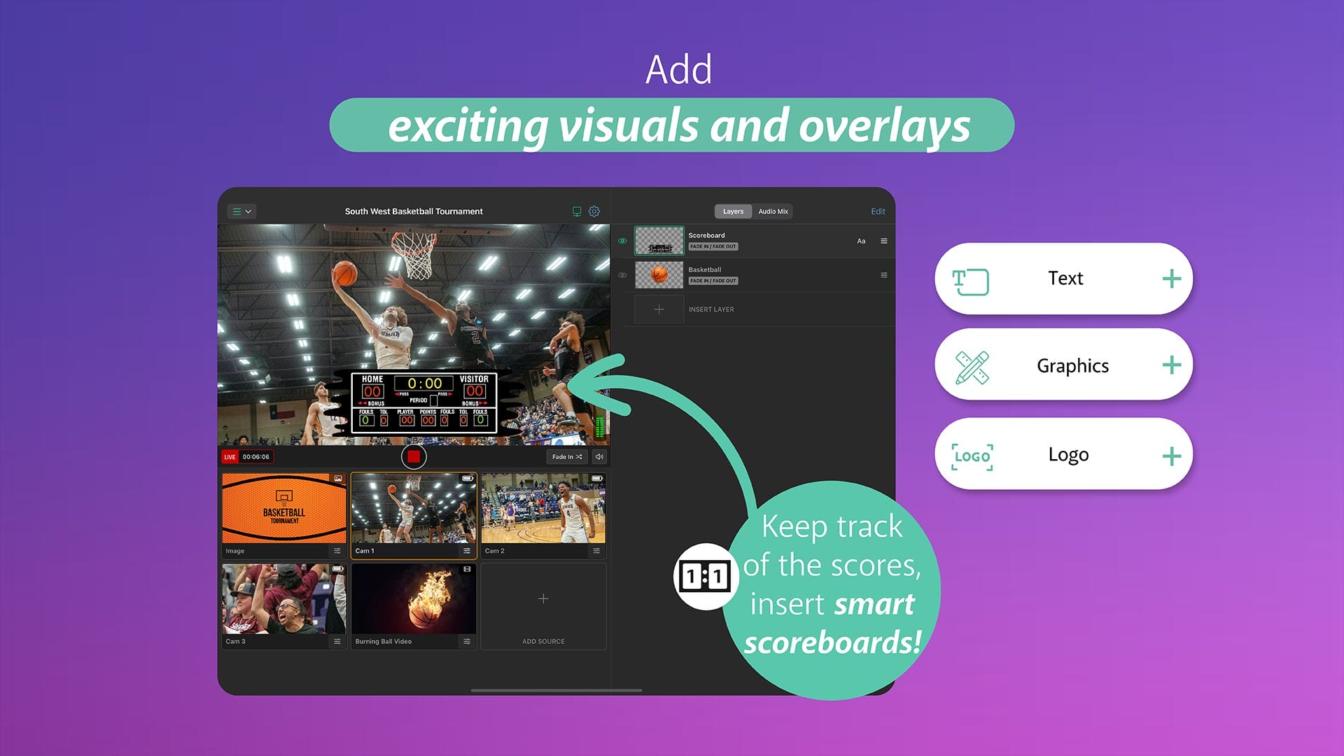 Integrate visuals, overlays, and real-time scoreboards to keep people engaged in your livestream