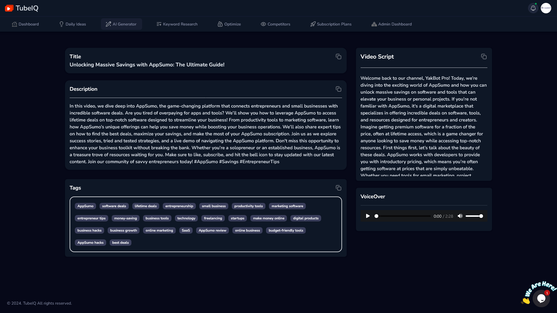Ready to crank out high-quality videos? With TubeIQ, you can produce a complete video script tailored to any topic in just seconds.