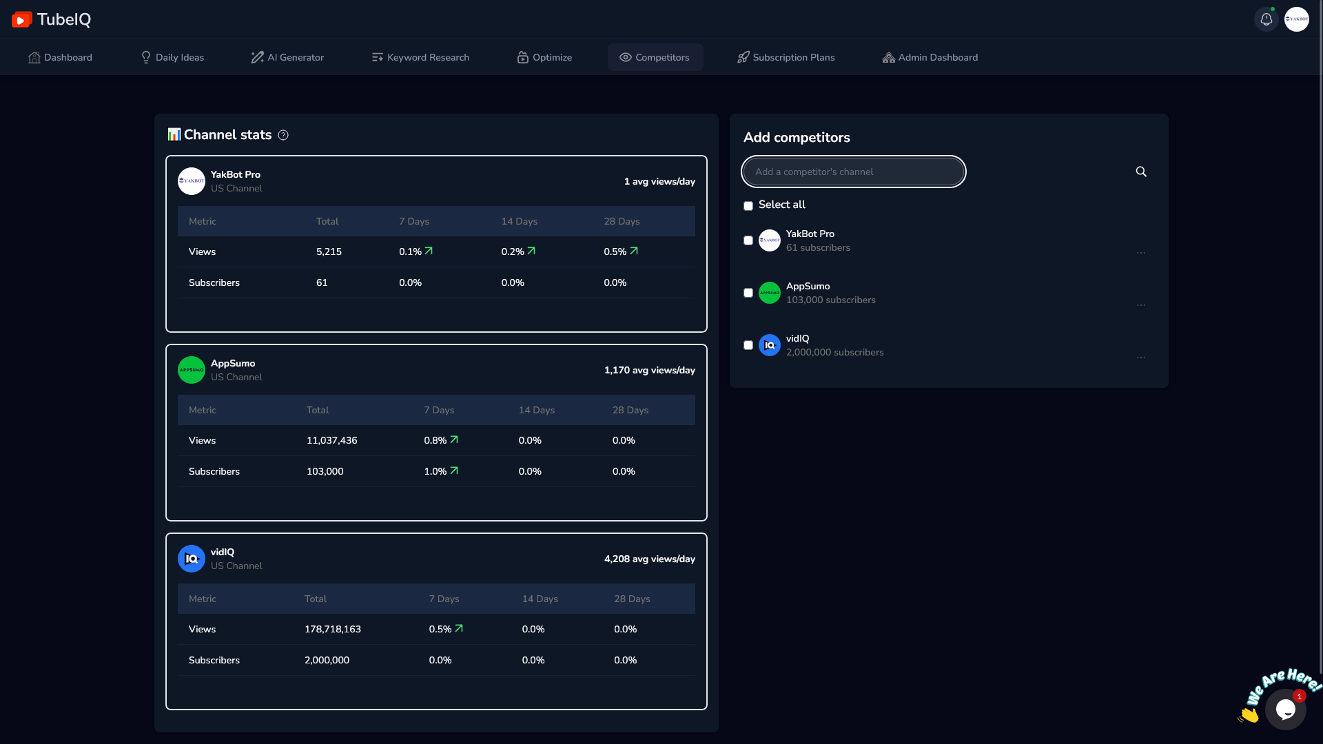 Best of all, TubeIQ lets you track the performance of YouTube competitors to gauge your progress and inform your content strategy.