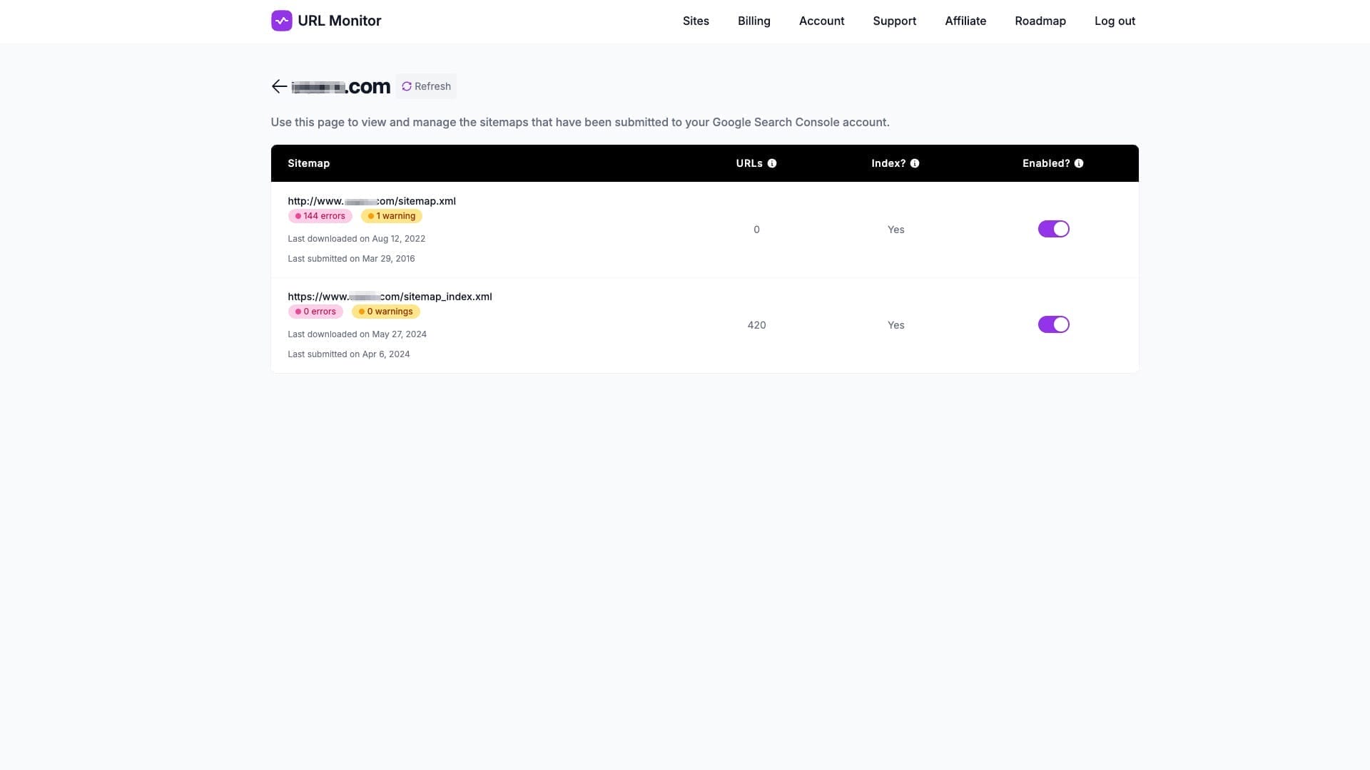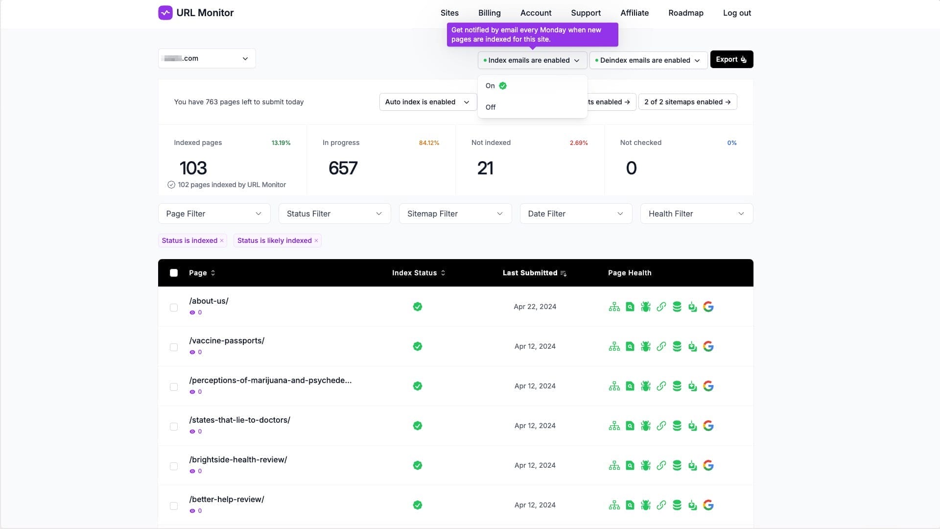 Once you enable auto-indexing, URL Monitor will submit your site pages to Google every day, ensuring nothing slips through the cracks.