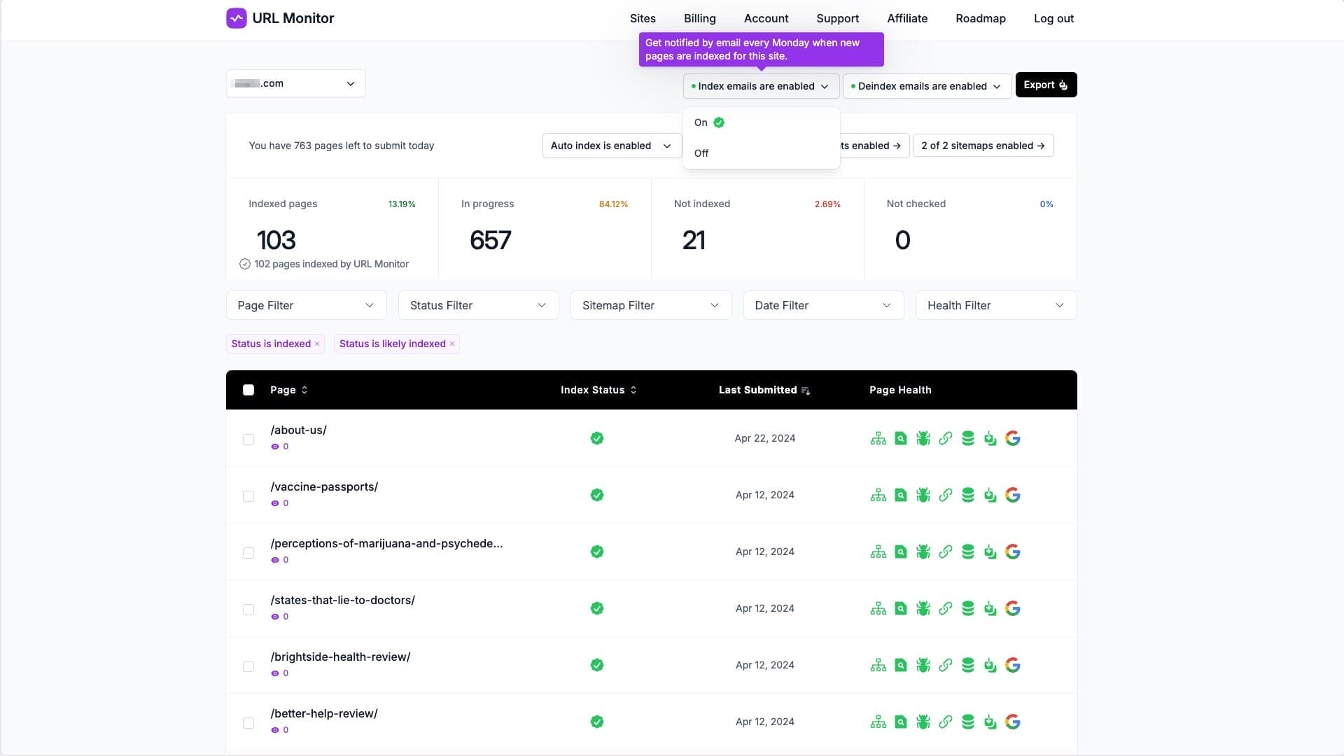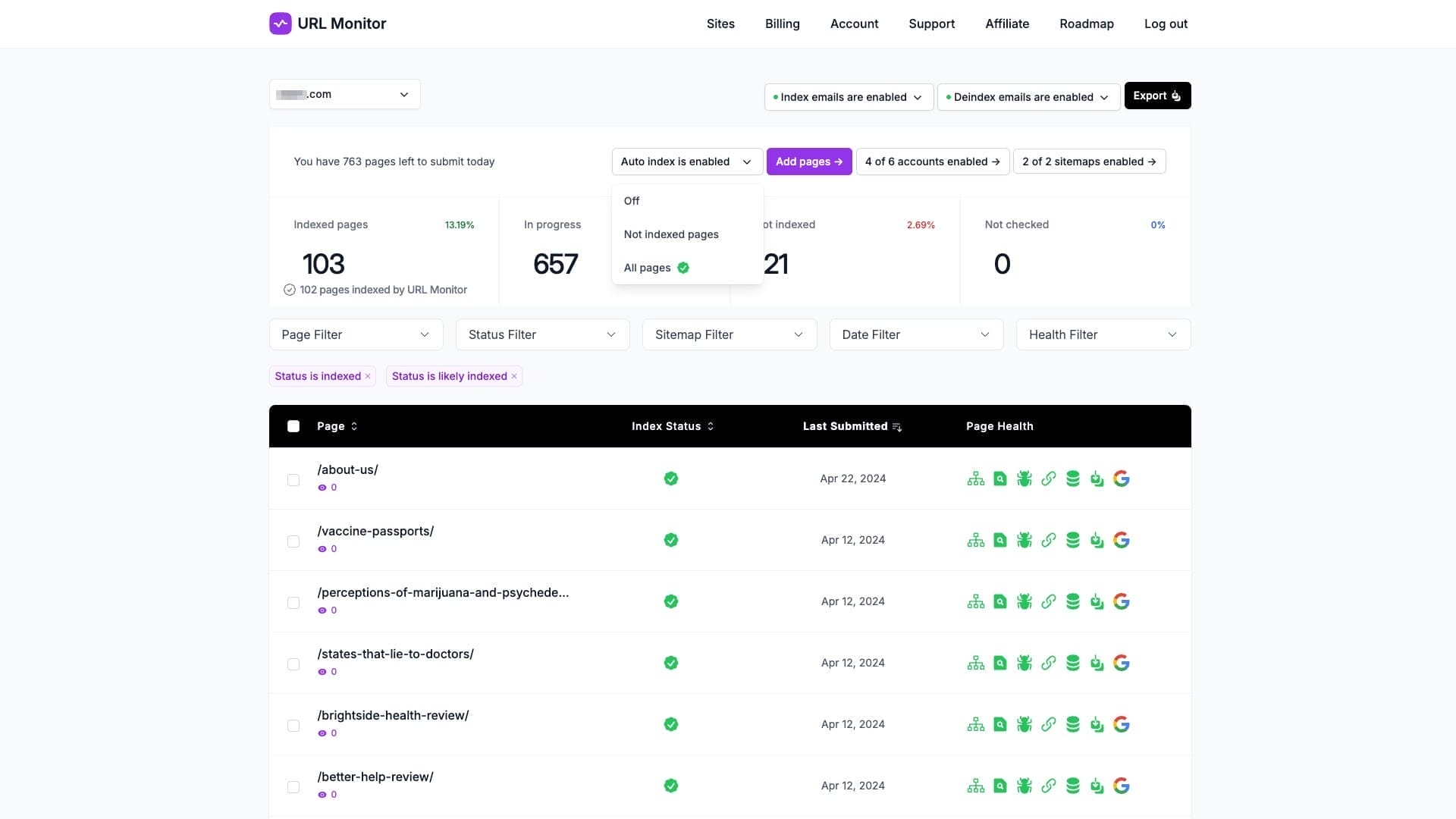 URL Monitor lets you quickly index your pages on Google and track their indexing status to drive more site traffic.